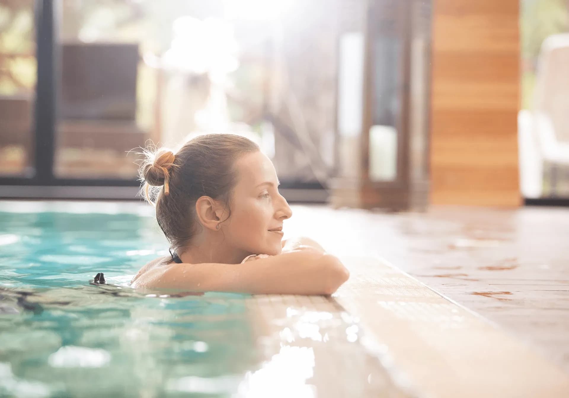 Spaavdelningen ligger högst upp i hotellet med en pool som sträcker sig 20 meter både inomhus och utomhus. Panoramautsikten över sjön är svår att hitta någon annanstans, och när du ligger i poolen kan det nästan kännas som att den går i ett med sjön nedanför.